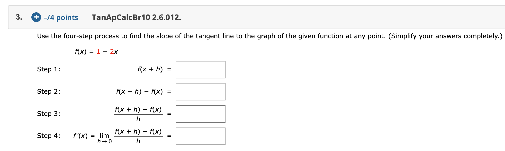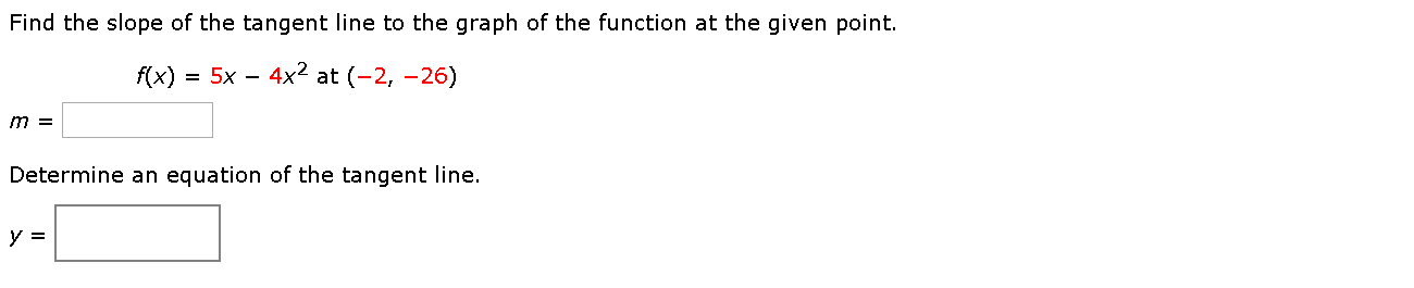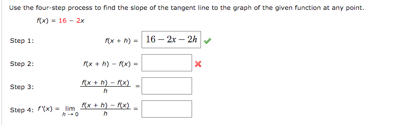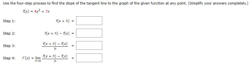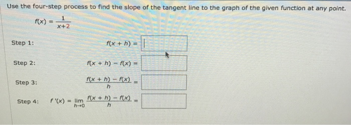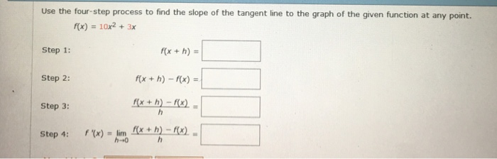 Four Step Process To Find The Slope Of A Tangent Line. F (x) = −10x^2 + 4x step 1: Step 1, write f(1 + h) = 4(1 + h)2 + 5(1 + h) + 6 = 4(1 + 2h+ h2) + 5 + 5h+ 6 = 15 + 13h+ 4h2: