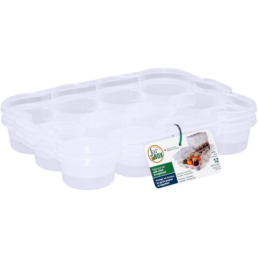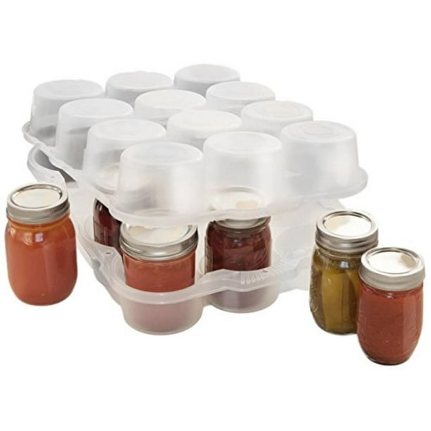 Jarbox is a pair of rigid plastic shells molded to safely nestle one dozen (12) canning jars, available in quart and pint sizes. The two shells snap firmly together, encasing their contents safely. Unbeatable sales has it listed correctly on their site but walmart.com does not.