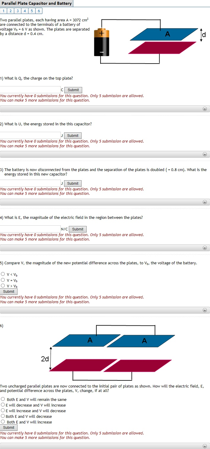 5 does the potential difference between the plates increase/decrease or remain the same as the plates are moved closer together? When we remove battery, capacitor is isolated so the charge will be the same. Express your answer with the appropriate units.