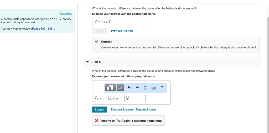 The potential difference between the plates after the battery is disconnected is 17 v. What is the potential difference between the plates after a sheet of teflon is inserted between them. What is the potential difference betwen the plates after a sheet of teflon is inserted between them?
