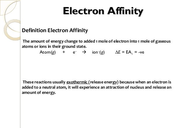 Atom, electron, electron affinity, electronegativity, endothermic reaction, exothermic reaction electron affinity is the amount of energy. When energy is absorbed from the electron as potential energy, the kinetic energy of the electron is released. Which reaction below represents the electron affinity of li?
