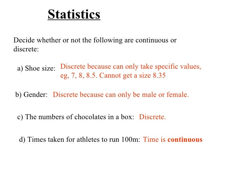 Discrete data is data where it has to be from a certain set of values e.g a shoe size can only be a certain value. Let us say at a certain school the height of students vary between 1 m and 3 m. Which variables are discrete continuous?