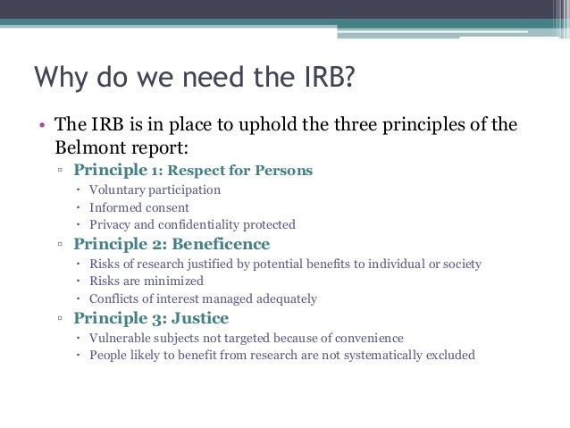 Benefits to the subjects, or from knowledge to be gained, should, outweigh the risks. The belmont principles are a set of guidelines the irb uses to interpret whether or not a research is ethical. It is commonly said that the first principle of medical ethics is “do no harm.” this principle can trace its origin back over 2,500 years to hippocrates.