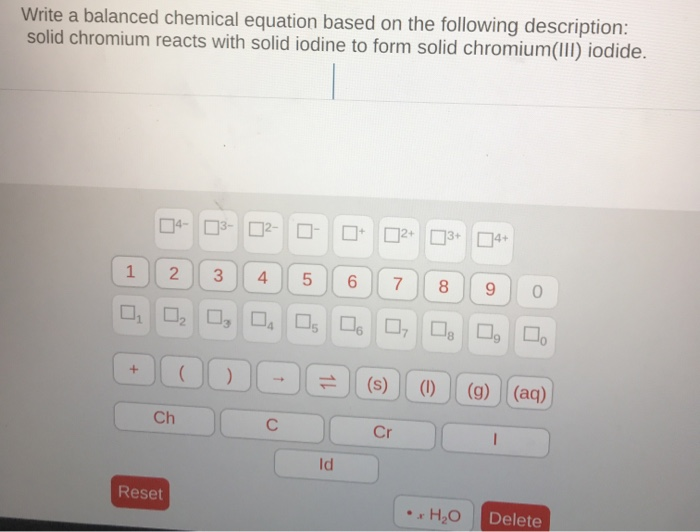 We are asked to balance the reaction between solid chromium and solid iodine that produces solid chromium (iii) iodide. Calculate molecular weight and chemical formula of chromium(ii) iodide or calculate molecular weight of different compounds using its molecular formula or its name. The si base unit for amount of substance is the mole.