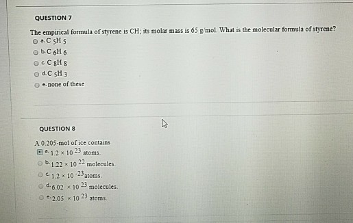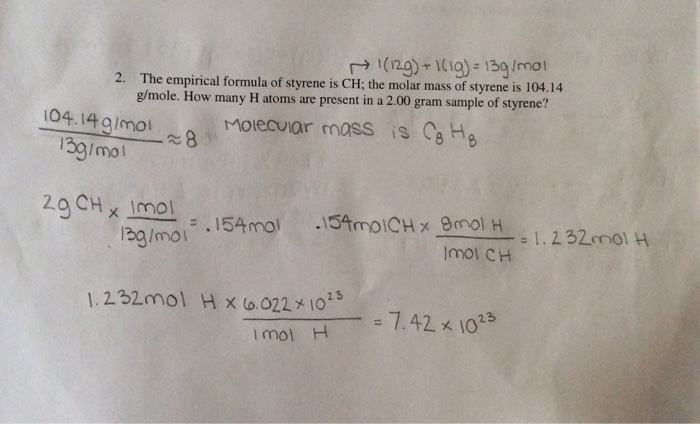Correct answer to the question the empirical formula of styrene is ch; It has a molar mass of 104g what is the multiplier to get the molecular formula? It has a molar mass of 104g what is the multiplier to get the molecular formula?